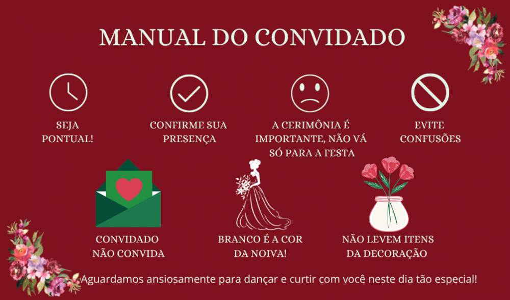 Aqui encontrarão dicas, lista de presente e localização da cerimônia/recepção.